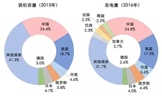 一是電力供應能力顯著增強。經(jīng)過多年努力,我國已經(jīng)完全扭轉(zhuǎn)了電力供應長期不足的局面。2016年底,中國電力裝機容量16.51億千瓦、發(fā)電量6.02萬億千瓦時,發(fā)電裝機容量、發(fā)電量和電網(wǎng)規(guī)模均居世界第一。電力供應能力總體較為充裕,除局部地區(qū)受電煤供應緊張、水庫來水偏枯等隨機性因素影響,出現(xiàn)個別時段電力供應偏緊外,全國電力供需總體平衡、個別省區(qū)略有富余。部分國家發(fā)電裝機容量(2015年)和發(fā)電量(2016年)占比情況見圖1。從圖中可以看出,中國發(fā)電裝機容量與發(fā)電量的占比均為約25%(2016年中國裝機容量又增加了1.2億千瓦)基本一致,說明了中國發(fā)電裝機的利用小時數(shù)與世界基本持平。