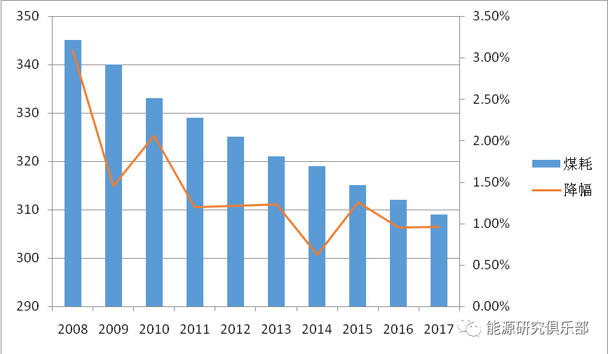 按照國(guó)家能源局發(fā)布的數(shù)據(jù),2017年全國(guó)供電標(biāo)準(zhǔn)煤耗309克/千瓦時(shí),同比再降3克/千瓦時(shí),持續(xù)近年來不斷降耗的趨勢(shì)。與2007年的356克/千瓦時(shí)相比,全國(guó)供電標(biāo)準(zhǔn)煤耗累計(jì)下降了47克/千瓦時(shí)。隨著標(biāo)準(zhǔn)煤耗的深度下降,年均減少的幅度并不很大,從降幅來看,總體呈現(xiàn)波動(dòng)中下降之勢(shì),但每下降1克都是可喜的難得成績(jī)。目前,我國(guó)已提前實(shí)現(xiàn)了“現(xiàn)役燃煤發(fā)電機(jī)組經(jīng)改造平均供電煤耗低于310克標(biāo)準(zhǔn)煤/千瓦時(shí)”的規(guī)劃目標(biāo)。