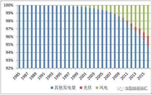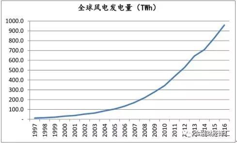 2016年,全球風電發(fā)電量在總發(fā)電量中的占比為3.87%,光伏占比為1.34%,二者合計僅為5.2%。但風電和光伏由于擁有清潔環(huán)保的優(yōu)勢,以及較大的成本下降潛力,未來的發(fā)展空間不可限量。