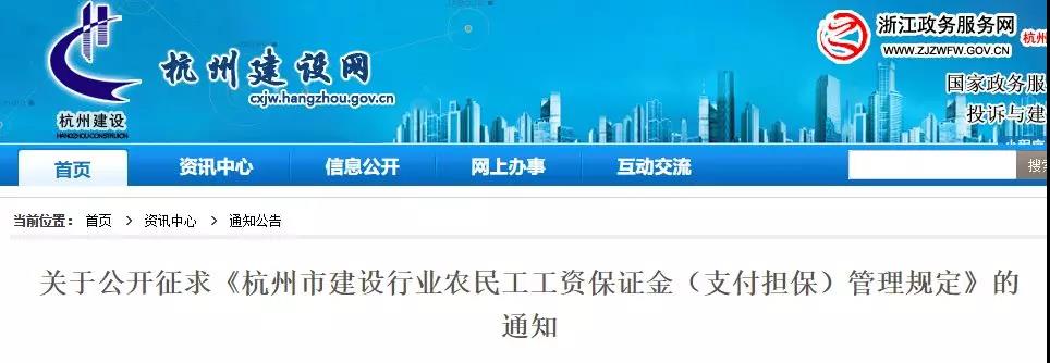 杭州市城建委發(fā)布了公開征求《杭州市建設(shè)行業(yè)農(nóng)民工工資保證金(支付擔(dān)保)管理規(guī)定》的通知。