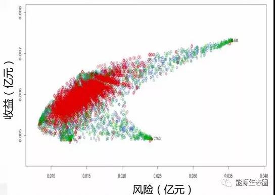不管是保底還是分成還是保底+分成,其中的比例和價(jià)格都有一個(gè)最優(yōu)配置策略,這在金融上叫做“有效邊界”,即上圖中左邊魚(yú)頭位置的點(diǎn),資產(chǎn)配置處于最高水平,即相同風(fēng)險(xiǎn)之下,能獲得的收益最大。
