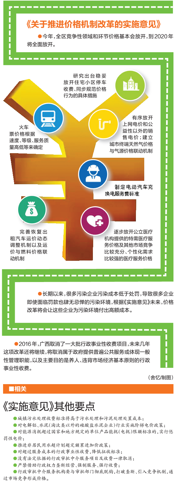 昨日,自治區(qū)黨委、政府印發(fā)《關(guān)于推進價格機制改革的實施意見》(以下簡稱《實施意見》),今年,全區(qū)競爭性領(lǐng)域和環(huán)節(jié)價格基本會放開,到2020年將全面放開。上網(wǎng)電價將逐步放開;醫(yī)療服務(wù)價格將形成分類管理、動態(tài)調(diào)整、多方參與的形成機制;交通運輸業(yè)將適時放開競爭性領(lǐng)域價格,擴大經(jīng)營者自主定價范圍;很多市民關(guān)心的放開價格后住宅小區(qū)的具體收費及管理政策也將在今年出臺。
