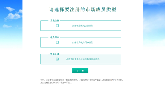 選擇售電公司,點(diǎn)擊后會(huì)自動(dòng)下載售電公司信用承諾書,然后點(diǎn)擊下一步進(jìn)行售電公司注冊(cè)。需要注意的是,下載的信用承諾書,需要打印并簽字蓋章,最后掃描成電子版,提交注冊(cè)信息時(shí)作為附件信息一并提交。
