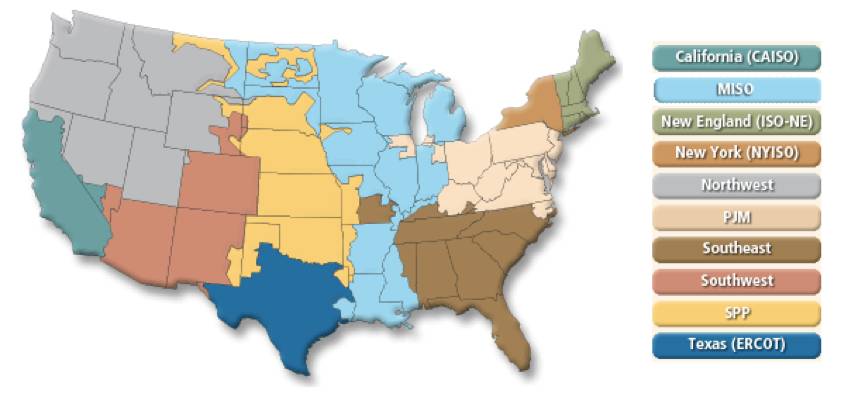 美國(guó)10個(gè)電力批發(fā)市場(chǎng)示意圖