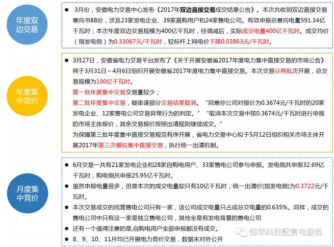 2017年年初至今,安徽共開(kāi)展了一次年度雙邊協(xié)商交易,一次年度集中競(jìng)價(jià)交易(分兩批),以及六次月度集中競(jìng)價(jià)交易。