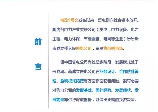 據(jù)媒體報(bào)道,電力體制改革6個(gè)配套文件即將出臺(tái),售電側(cè)改革試點(diǎn)進(jìn)入倒計(jì)時(shí)。新電改會(huì)帶來(lái)很多巨大商機(jī),比如售電制改革,鼓勵(lì)社會(huì)資本市場(chǎng)進(jìn)入,包括配電領(lǐng)域混合所有制改革。所以從售電公司角度看,更多的關(guān)注電