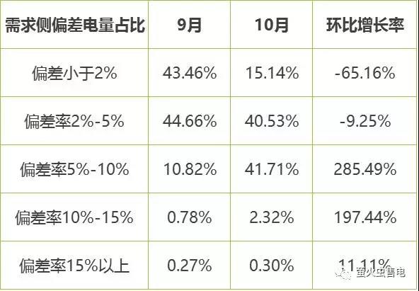 10月市場電量偏差率控制情況遠(yuǎn)不如上月。偏差率小于2%的用電量占比環(huán)比降幅65%。9月份偏差率低于5%的電量占全市場電量的88%,而10月份,這一數(shù)據(jù)僅為55%。
