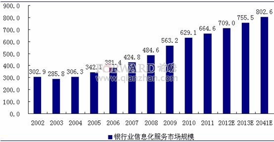 數(shù)據(jù)顯示,2002年以來,我國銀行業(yè)信息化建設(shè)規(guī)模整體呈上升趨勢,由2002年的302.5億元增加至2011年的664.6億元,預(yù)計未來三年,銀行業(yè)信息化的市場規(guī)模將繼續(xù)增長,銀行業(yè)也將繼續(xù)保持金融業(yè)信息化市場需求的主要子行業(yè)的地位,預(yù)計銀行業(yè)信息化的市場規(guī)模也有望由2012年的709億元增長至2014年的802.6億元。