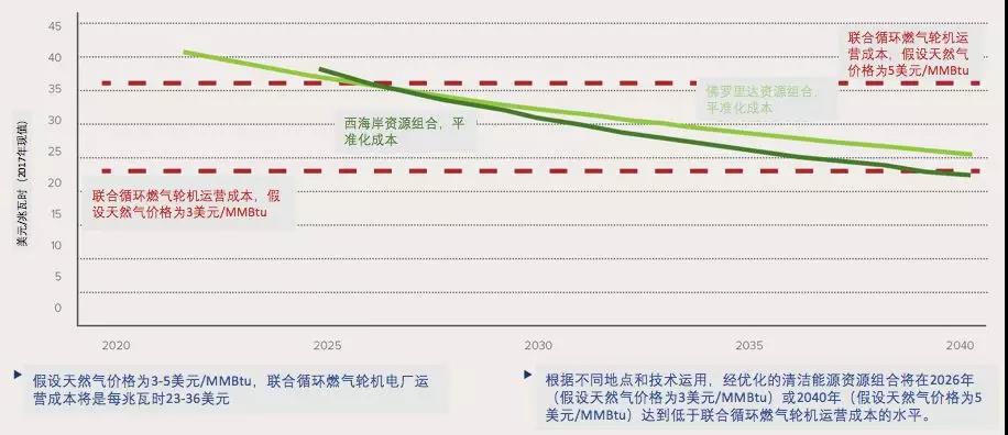 圖3:2020-2040年間聯(lián)合循環(huán)燃?xì)廨啓C(jī)運(yùn)營(yíng)成本與清潔能源資源組合平準(zhǔn)化成本對(duì)比