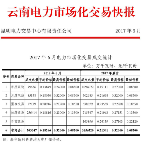 6月云南電力市場化交易快報:交易電量、價格均下滑
