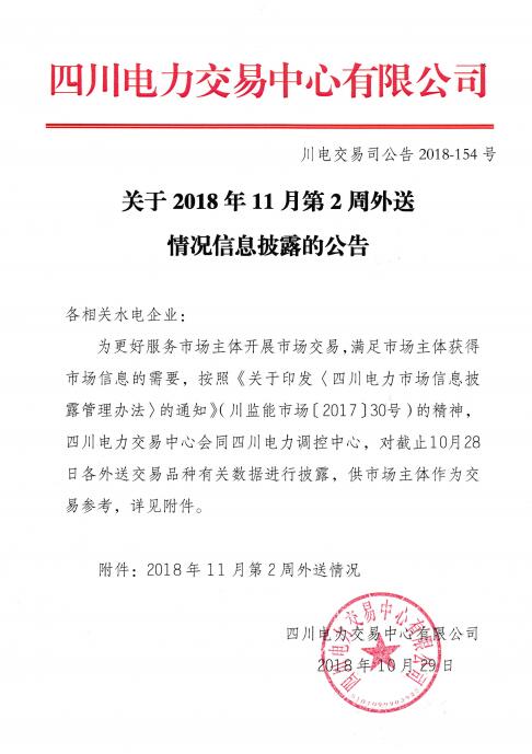 四川電力交易中心日前發(fā)布了《關(guān)于2018年11月第2周外送情況信息披露的公告》,四川電力交易中心會(huì)同四川電力調(diào)控中心,對(duì)截止10月28日各外送交易品種有關(guān)數(shù)據(jù)進(jìn)行披露