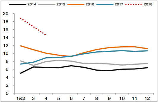 2014-2018國內(nèi)月度用電量增速統(tǒng)計(jì)(百分比)