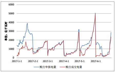 圖 3.17 2017 年上半年日前電量交易申報(bào)電量、成交電量對比