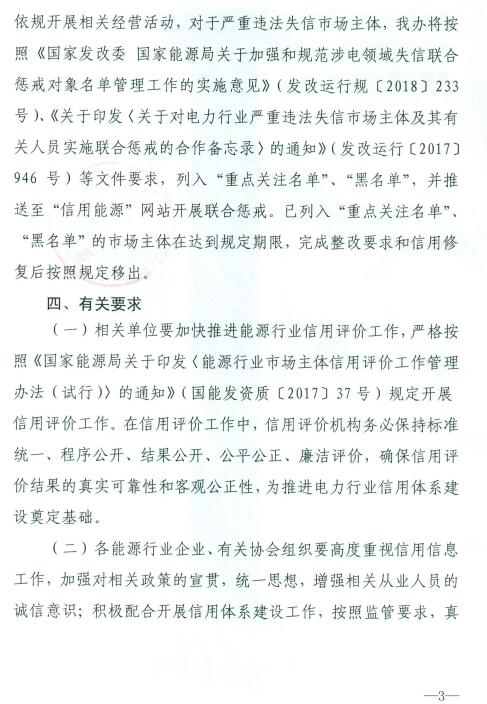 各能源行業(yè)企業(yè)、有關(guān)協(xié)會組織要按照監(jiān)管要求,真實完整的報送安全生產(chǎn)、工程建設(shè)、市場交易、節(jié)能環(huán)保等領(lǐng)域涉及信用的信息。