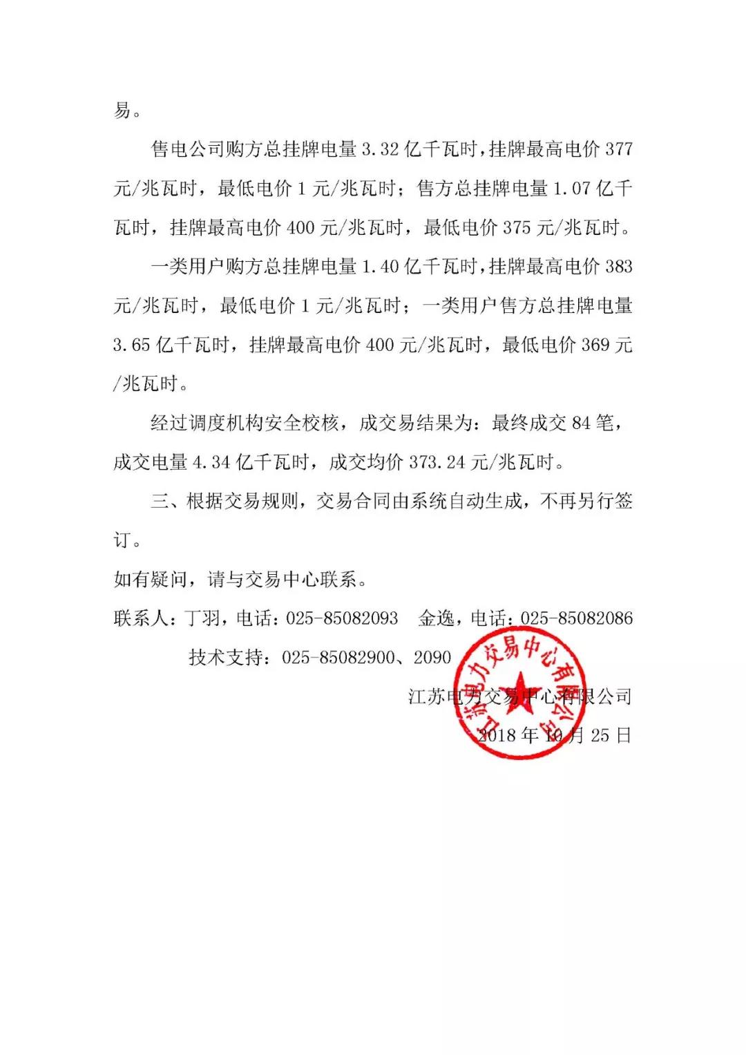 2018年10月江蘇省月內(nèi)增量交易及購電側(cè)月內(nèi)合同電量轉(zhuǎn)讓交易結(jié)果公示