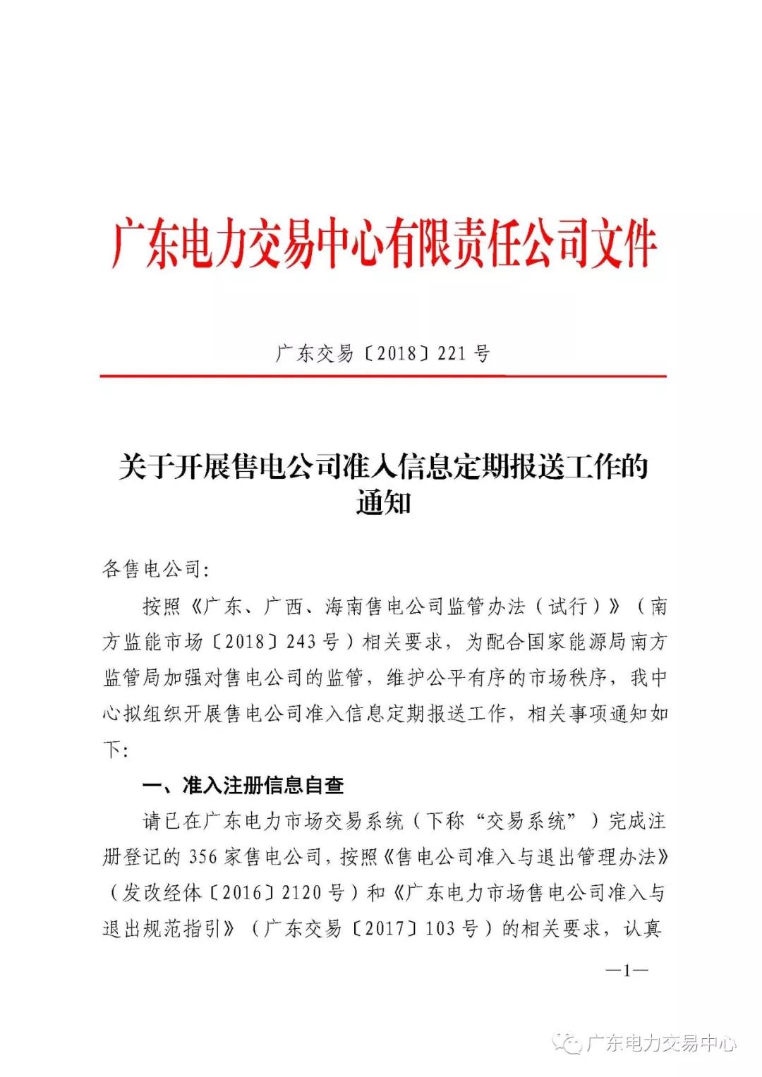 廣東電力交易中心日前發(fā)布了《關(guān)于開展售電公司準(zhǔn)入信息定期報送工作的通知》,廣東擬組織開展售電公司準(zhǔn)入信息定期報送工作,已完成注冊等級的356家售電公司需認(rèn)真開展準(zhǔn)入信息自糾自查工作。對于存在準(zhǔn)入注冊信息未完全填報、不滿足售電公司準(zhǔn)入條件要求或?qū)嶋H情況已變更但尚未完成注冊信息變更等情形的, 請于2018年11月30日前補充完善,并上傳相應(yīng)證明材料。