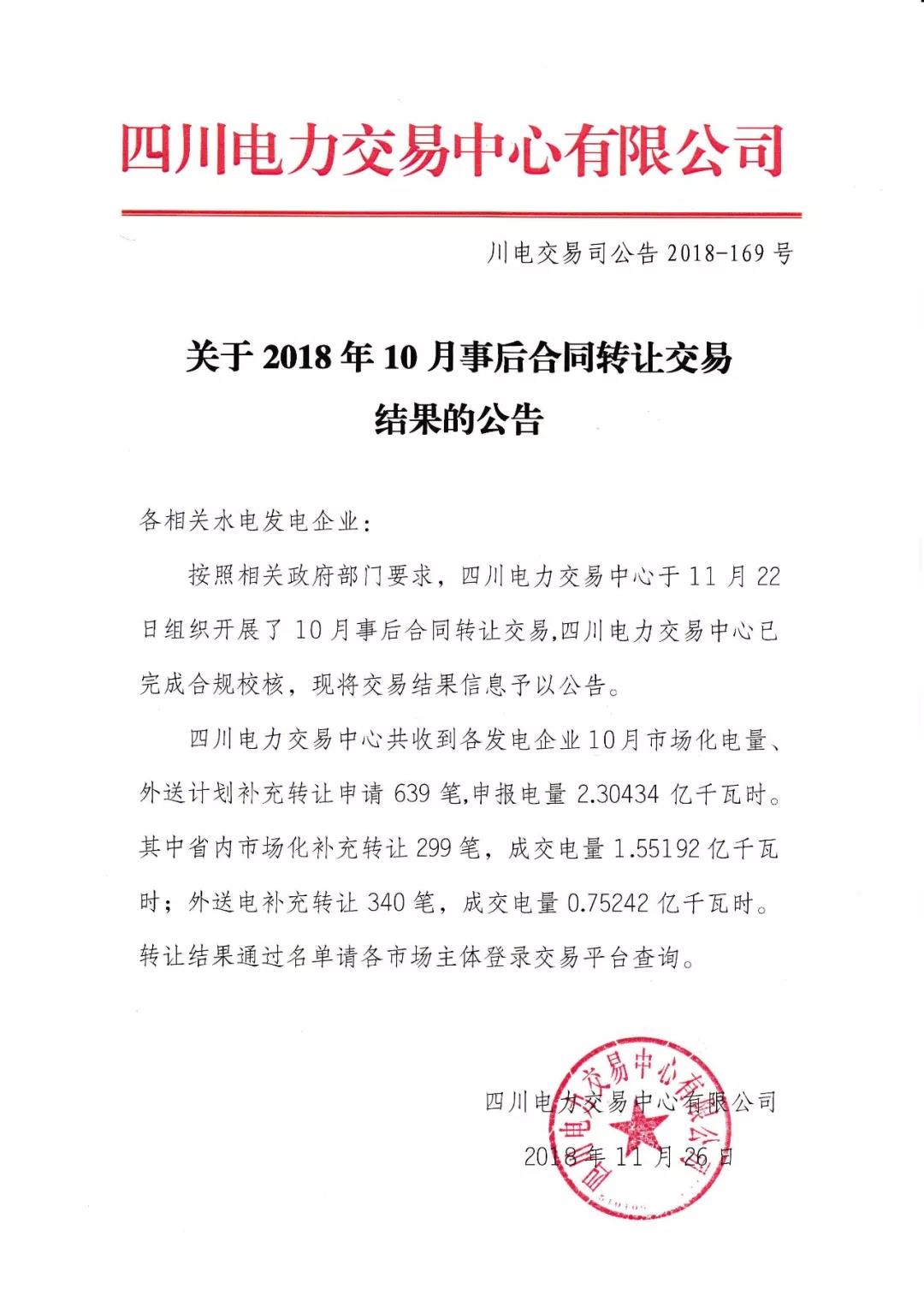 公告 | 四川電力交易中心關于2018年10月事后合同轉(zhuǎn)讓交易結果的公告