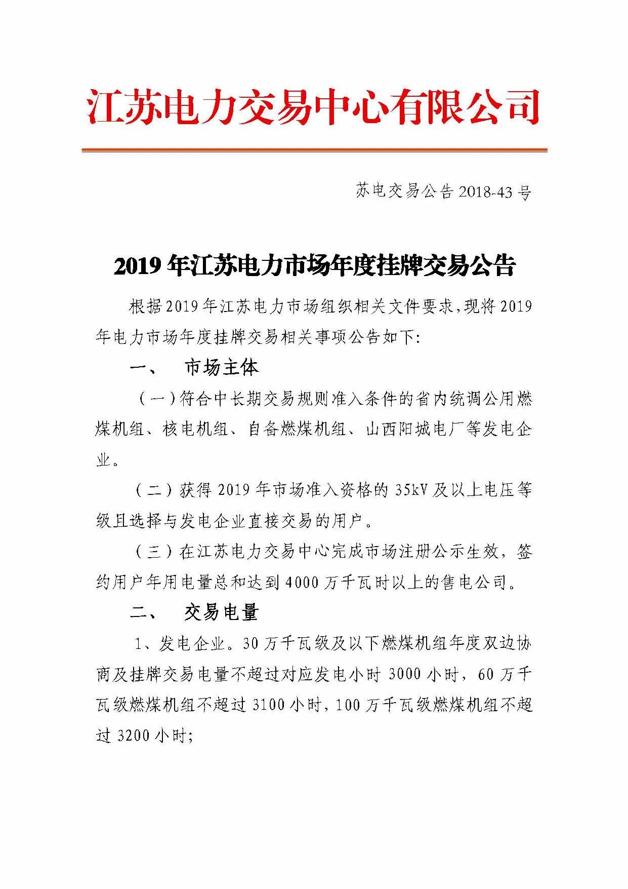 江蘇電力交易中心日前發(fā)布了《2019年江蘇電力市場(chǎng)年度掛牌交易公告》,本次交易采取連續(xù)掛牌交易,申報(bào)時(shí)間為2018年12月17日、18日的10:00至12:00,14:00至16:00。