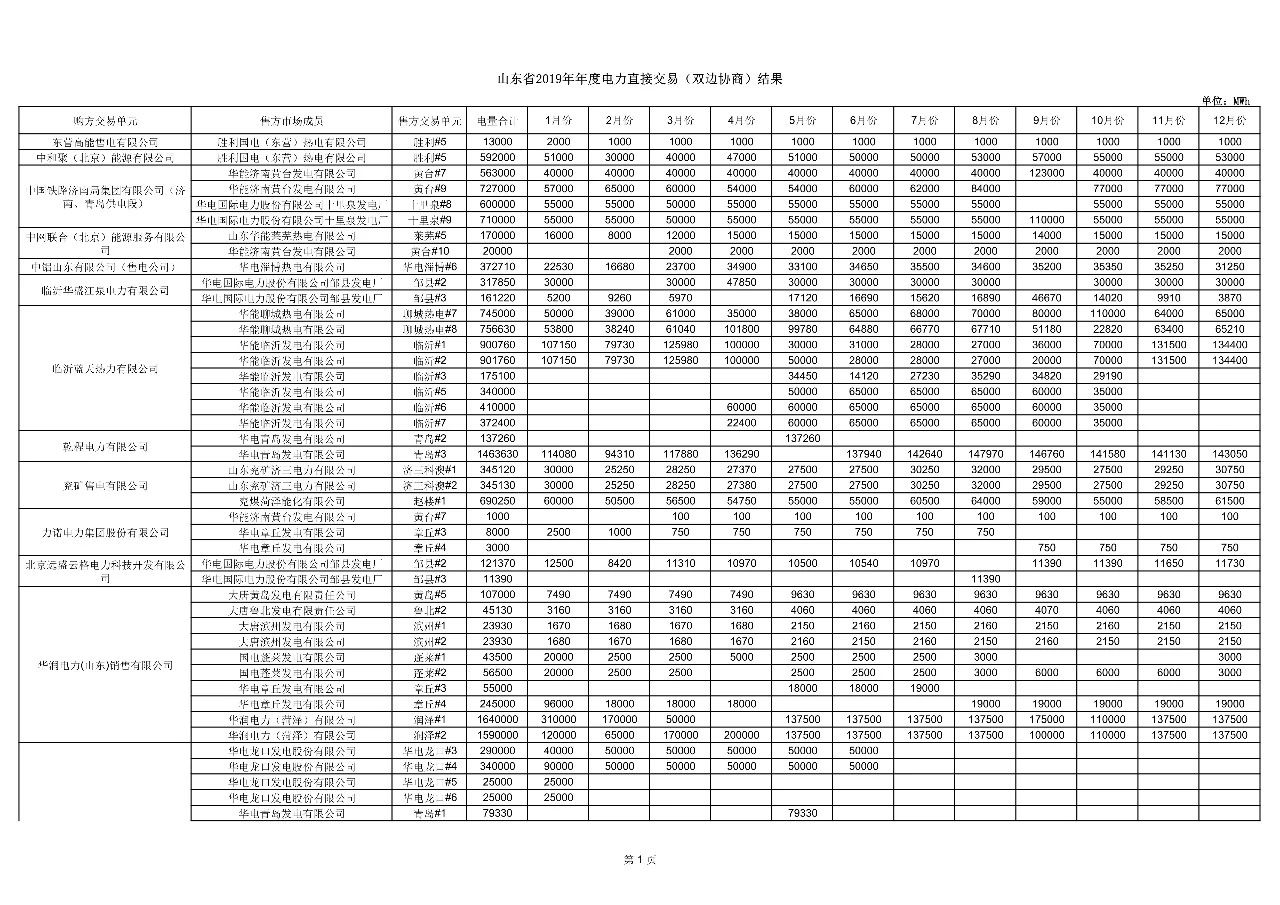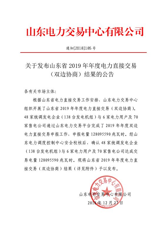 山東電力交易中心發(fā)布了《關(guān)于發(fā)布山東省2019年年度電力直接交易(雙邊協(xié)商)結(jié)果的公告》