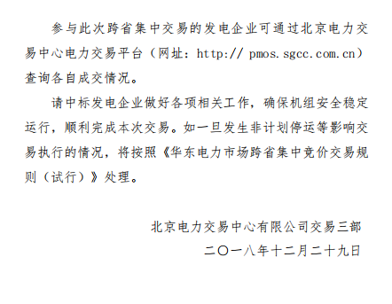 北京電力交易中心發(fā)布了《關(guān)于發(fā)布2019年1月上海購?fù)铍姈|送掛牌交易結(jié)果的通知》