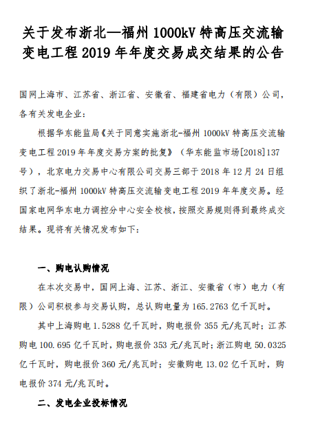 北京電力交易中心發(fā)布了《關(guān)于發(fā)布浙北—福州1000kV特高壓交流輸變電工程2019年年度交易成交結(jié)果的公告》