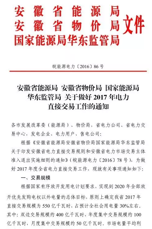 安徽省發(fā)布2017年電力直接交易關鍵信息