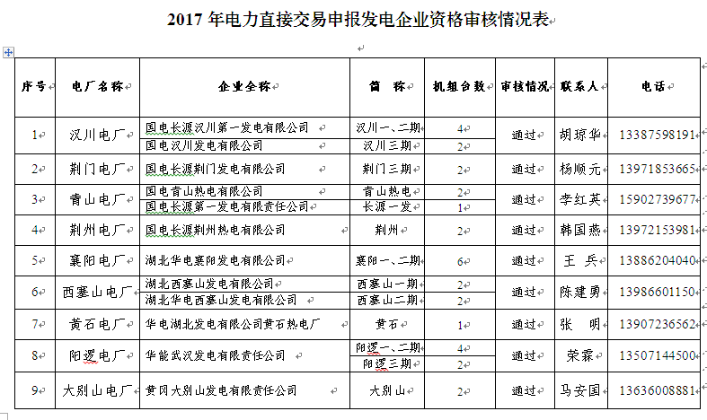 近日,省電力直接交易聯(lián)合工作小組召開專題審查會,按照省政府要求和《湖北省電力用戶與發(fā)電企業(yè)直接交易管理暫行辦法》、省發(fā)展改革委《關(guān)于組織開展2017年度電力直接交易工作的通知》規(guī)定的條件,對申報參加2017年電力直接交易的21家發(fā)電企業(yè)和288家用戶進(jìn)行了資格審核,現(xiàn)將審核情況予以公示(附件一、附件二)。