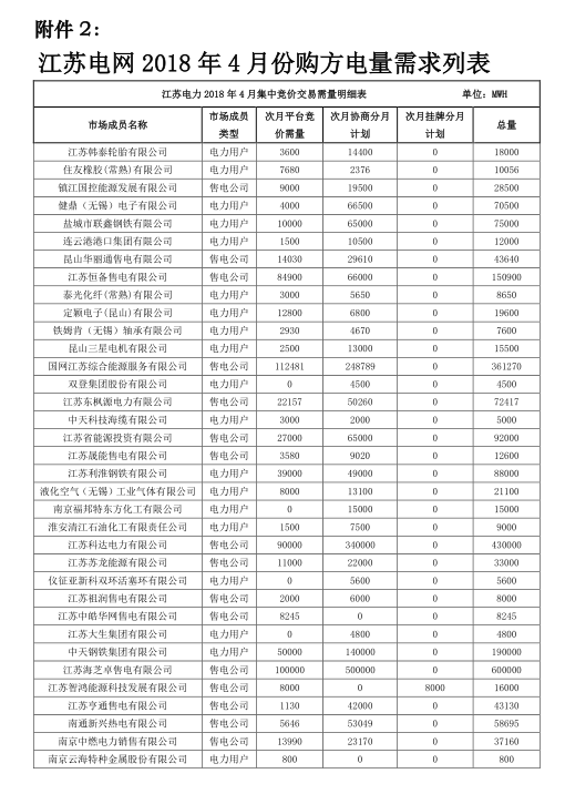 江蘇電力交易中心日前發(fā)布了《2018年4月份江蘇省電力集中競(jìng)價(jià)交易公告》,參與交易的市場(chǎng)主體有單機(jī)容量13 5萬(wàn)千瓦級(jí)及以上公用燃煤機(jī)組、