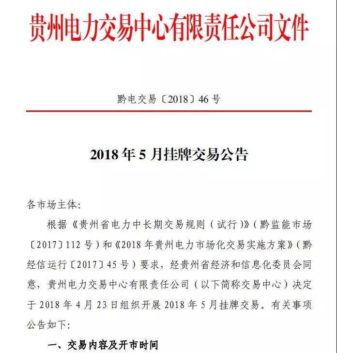 貴州電力交易中心日前發(fā)布了《2018年5月掛牌交易公告》