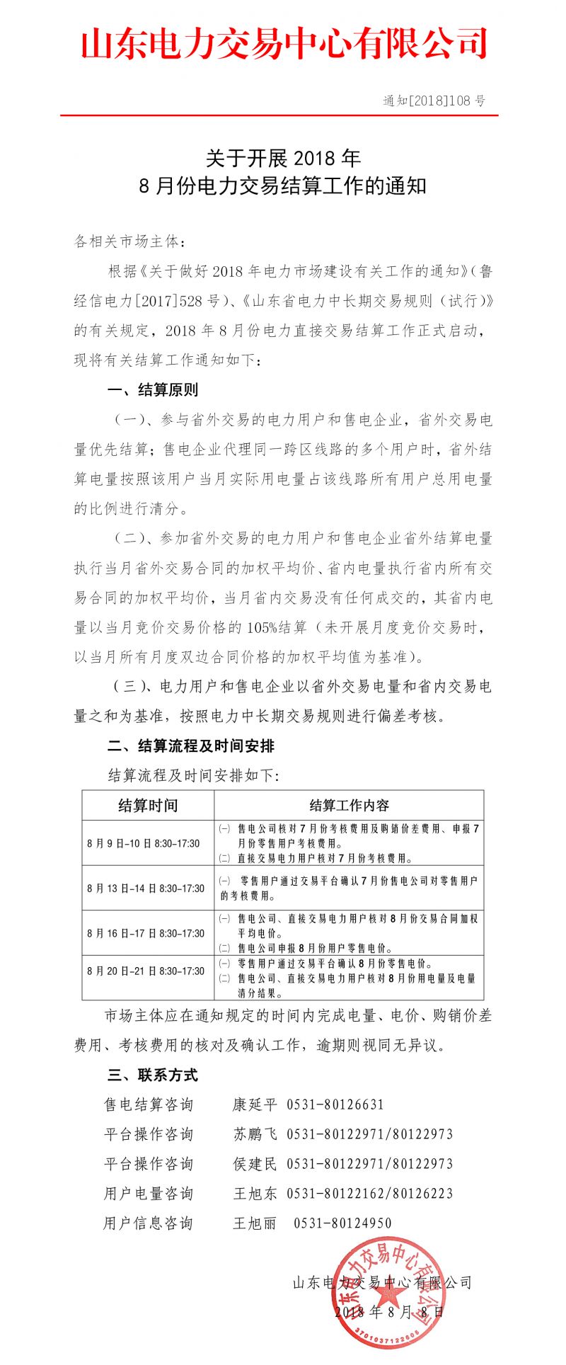 山東2018年8月份電力交易結(jié)算工作:9日正式啟動(dòng)