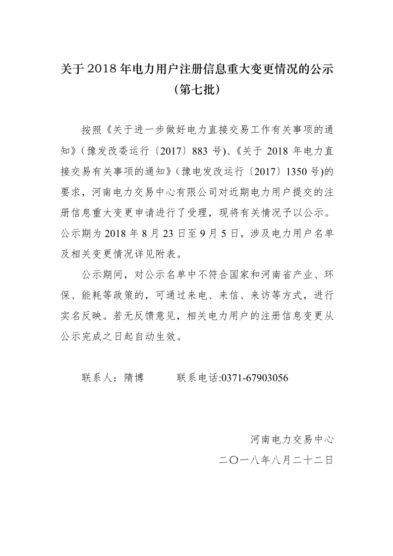 河南2018年電力用戶(hù)重大注冊(cè)信息變更情況公示(第七批)