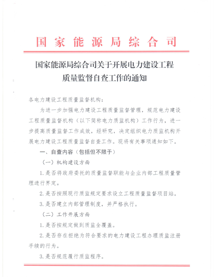 國家能源局綜合司關(guān)于開展電力建設(shè)工程質(zhì)量監(jiān)督自查工作的通知