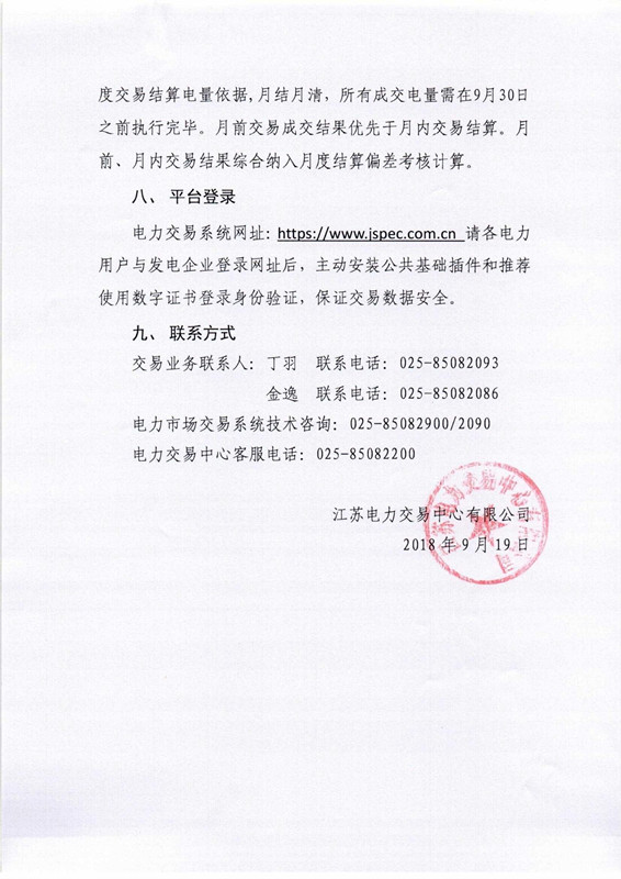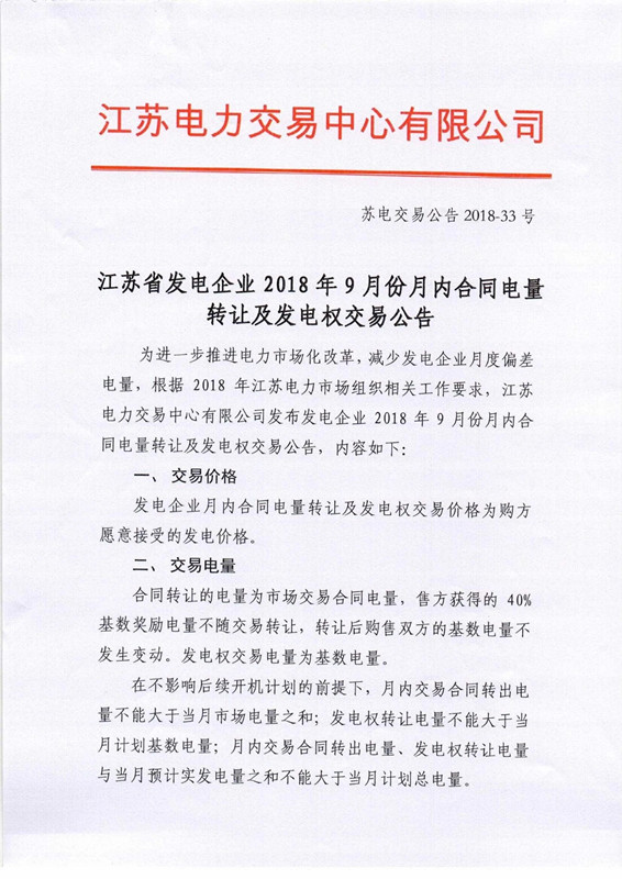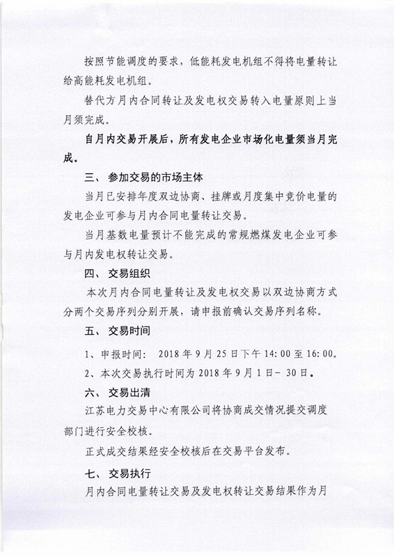 江蘇2018年9月月內合同電量轉讓及發(fā)電權交易9月25日展開