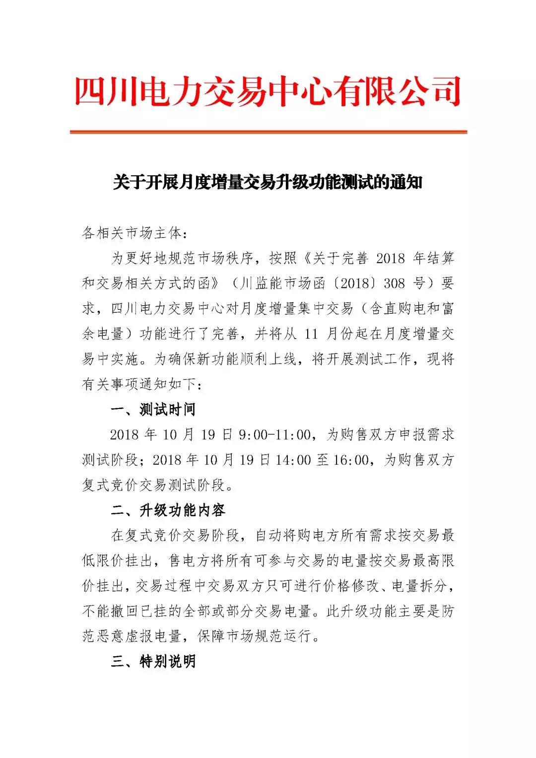 通知 | 四川關(guān)于開展月度增量交易升級(jí)功能測(cè)試的通知