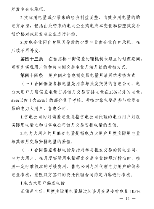 參與批發(fā)交易的售電公司、電力大用戶月度偏差電量占其該月交易安排電量在±5以外的電量,±5%以內(nèi)(含±5%)的部分免于考核??己藢?duì)象為參與批發(fā)交易的電力大用戶、售電公司。