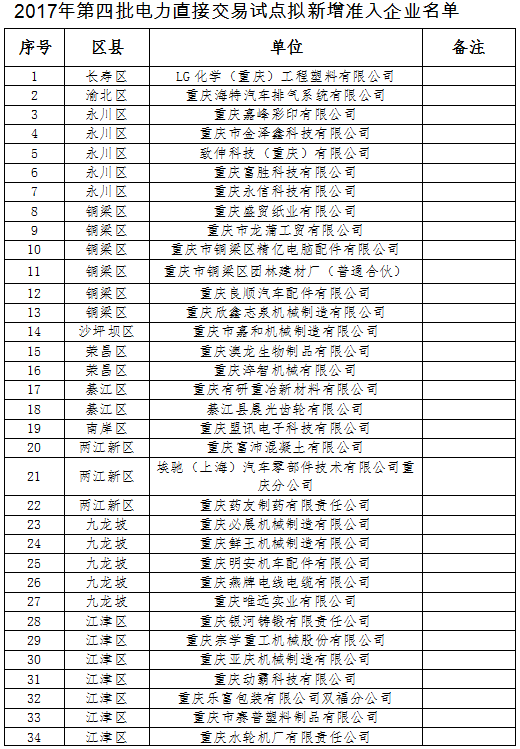 重慶市2017年第四批電力直接交易試點(diǎn)新增準(zhǔn)入企業(yè)公示名單