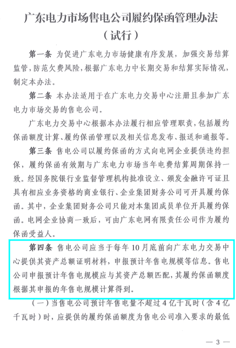 售電公司應(yīng)當(dāng)于每年10月底前向廣東電力交易中心提供其資產(chǎn)總額證明材料,申報(bào)預(yù)計(jì)售電規(guī)模等信息。