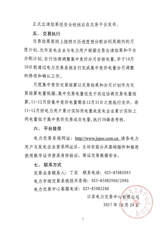 江蘇電力交易中心有限公司根據(jù)申報結果,在10月27日11:00開始出清、本次交易采用邊際統(tǒng)一出清方式確定成交結果。11至12月份集中競價電量需在12月31日之前執(zhí)行完畢。若11至12月份電力用戶累計實際用電量或發(fā)電企業(yè)累計實際上網(wǎng)電量低于集中競價交易成交電量,執(zhí)行3%偏差考核。
