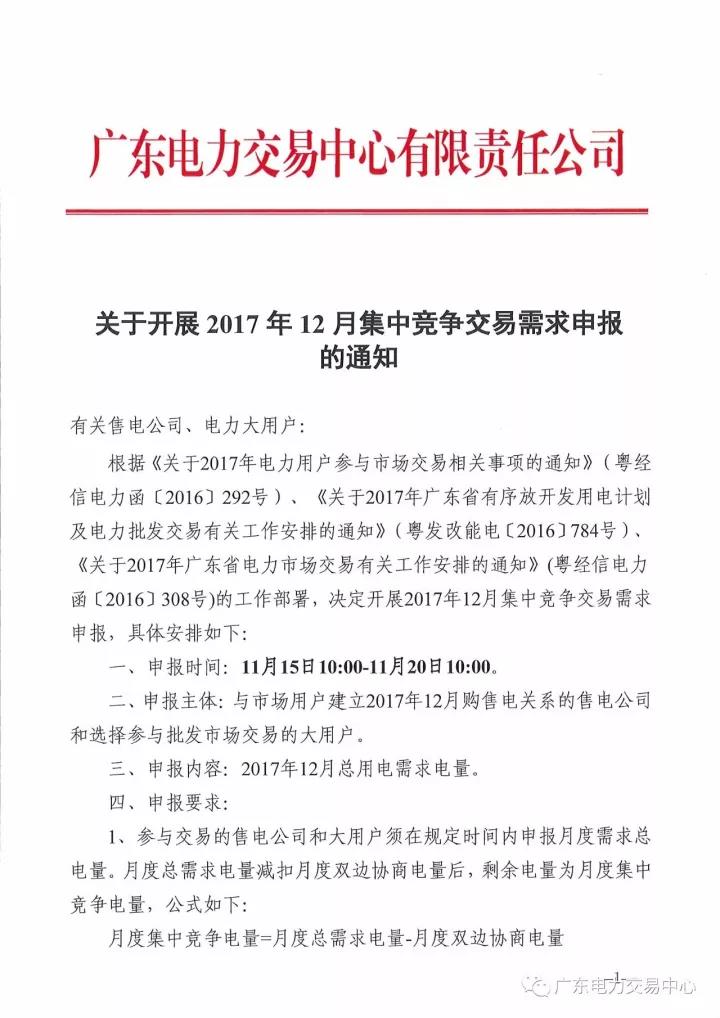 11月16日,廣東電力交易中心發(fā)布了《關(guān)于開展2017年12月集中競(jìng)爭(zhēng)交易需求申報(bào)的通知》,通知稱,申報(bào)主體為與市場(chǎng)用戶建立2017年12月購售電關(guān)系的售電公司與選擇參與批發(fā)市場(chǎng)交易的大用戶,申報(bào)內(nèi)容為2017年12月