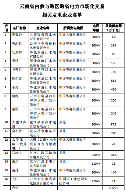 廣州電力交易中心:16家云南省內(nèi)發(fā)電企業(yè)參與跨區(qū)跨省電力市場化交易