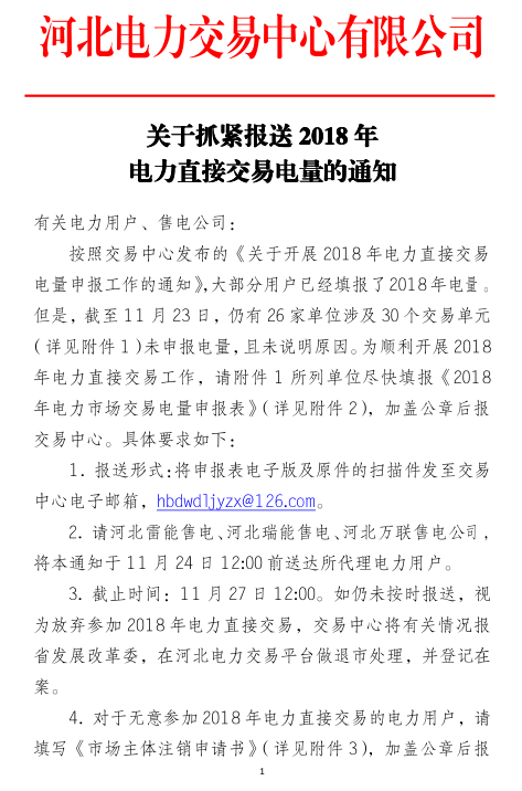 河北電力交易中心發(fā)布關(guān)于抓緊報送2018年電力直接交易電量的通知:仍有26家單位30個交易單元未申報