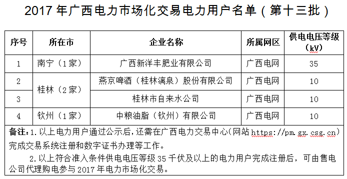 廣西2017年電力市場化交易電力用戶準(zhǔn)入公示名單(第十三批)