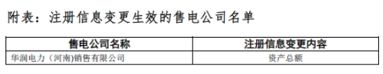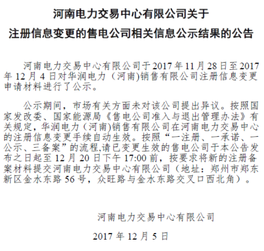 12月5日,河南電力交易中心發(fā)布了《關于注冊信息變更的售電公司相關信息公示結果的公告》,稱中心于11月28日至12月4日,對華潤電力(河南)銷售有限公司注冊信息變更申請材料進行了公示,公示期間,市場方面無異議