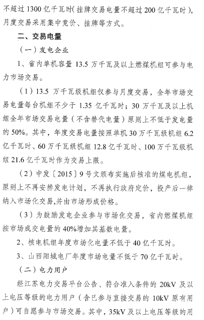 12月6日,江蘇電力交易中心發(fā)布了《關(guān)于開展2018年電力交易的通知》,通知稱2018年,全省電力直接交易規(guī)模約1900億千瓦時,其中年度交易采用雙邊協(xié)商和掛牌方式,原則上年度交易電量不超過1300億千瓦時(掛牌交易電量不超過200億千瓦時),月度交易采用集中競價、掛牌等方式。