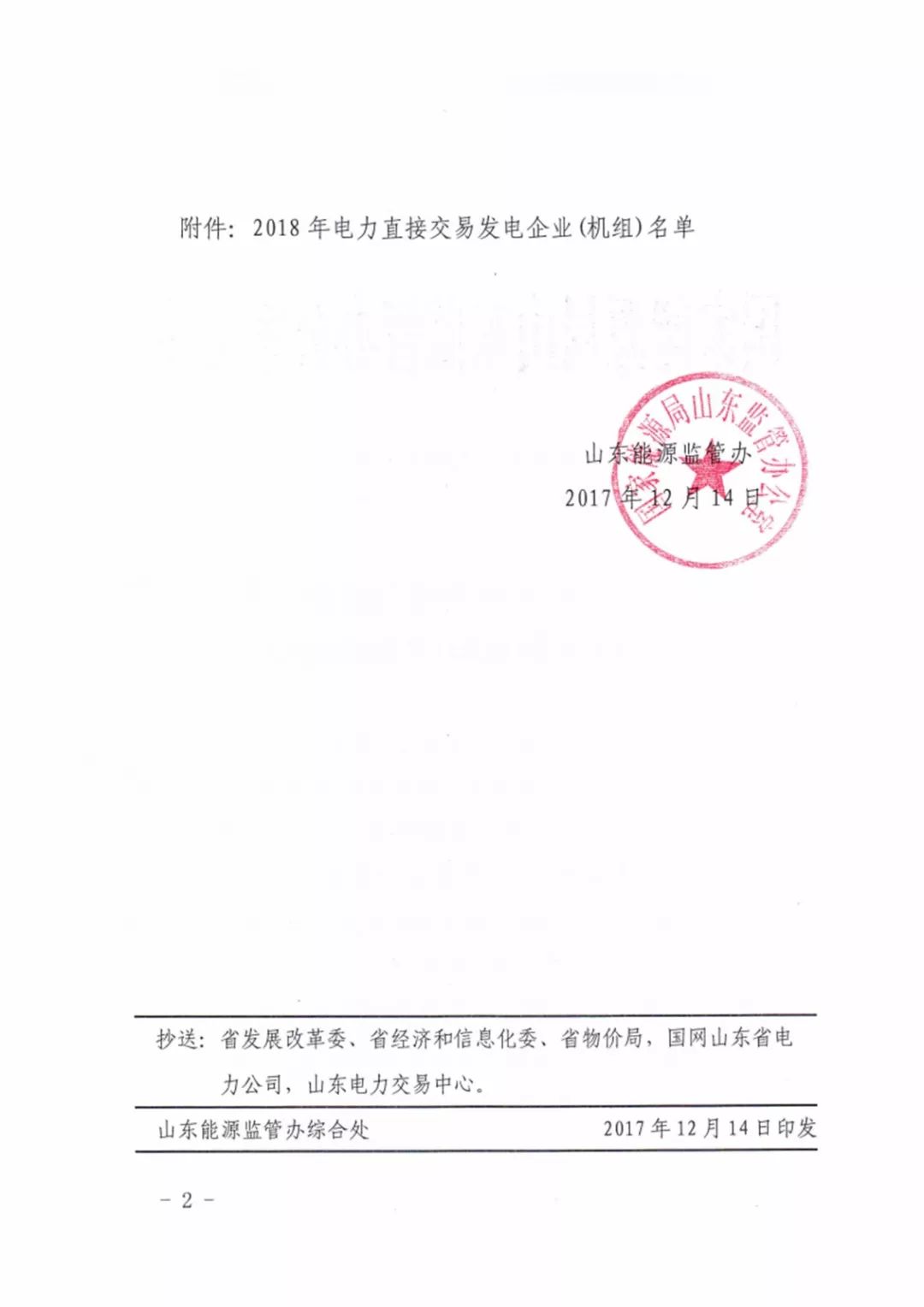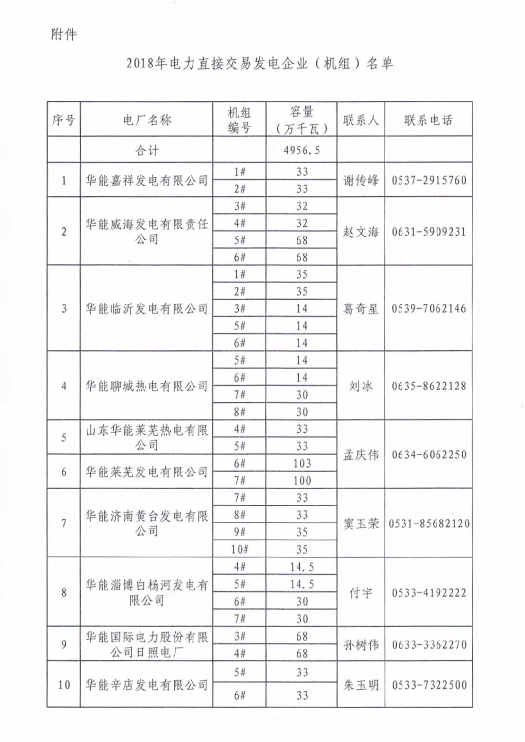 山東2018年電力直接交易發(fā)電企業(yè)(機組)名單