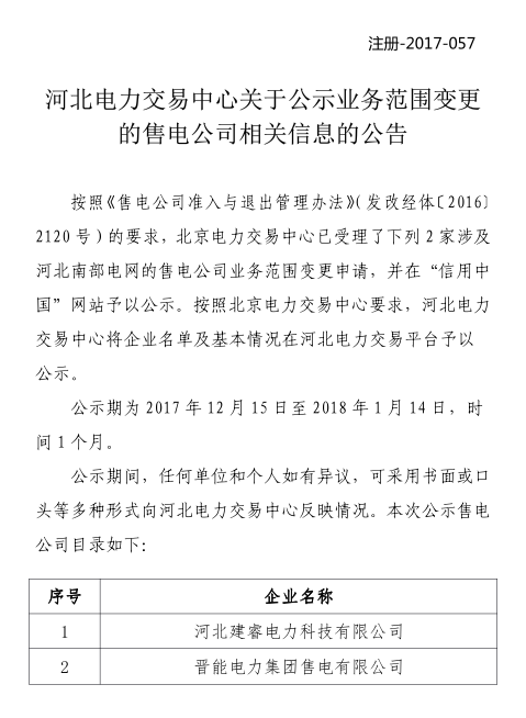 河北電力交易中心日前發(fā)布了關(guān)于公示業(yè)務(wù)范圍變更的售電公司相關(guān)信息的公告,公告中對2家涉及河北南部電網(wǎng)的售電公司業(yè)務(wù)范圍變更申請進(jìn)行了公示,公示期為2017年12月15日至2018年1月14日。詳情如下: