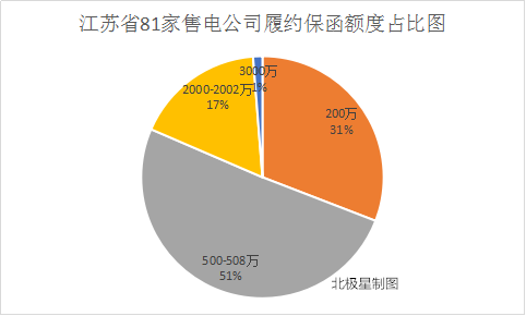 在第二次更新的81家售電公司名單中,小編注意到,3000萬保函額度的依然只有江蘇海瀾電力有限公司1家;2000-2002萬之間的有14家售電公司;500-508萬之間的售電公司有41家;200萬的有25家。
