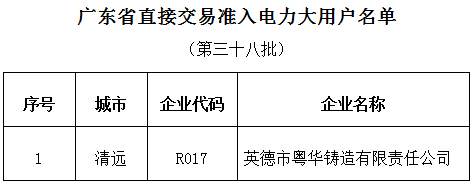 廣東省經(jīng)信委日前印發(fā)了第三十八批直接交易準入電力大用戶名單,認定原屬落后產(chǎn)能的英德市粵華鑄造有限責任公司已完成整改工作,符合與發(fā)電企業(yè)直接交易擴大試點準入條件,詳情如下:
