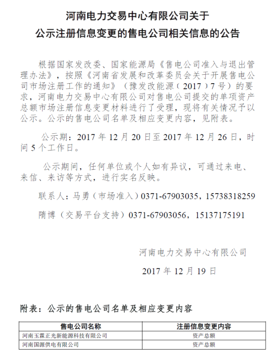 河南電力交易中心日前發(fā)布了關(guān)于公示注冊(cè)信息變更的售電公司相關(guān)信息的公告,公告中對(duì)2家售電公司單項(xiàng)資產(chǎn)總額市場(chǎng)注冊(cè)信息變更材料進(jìn)行了公示,詳情如下:
