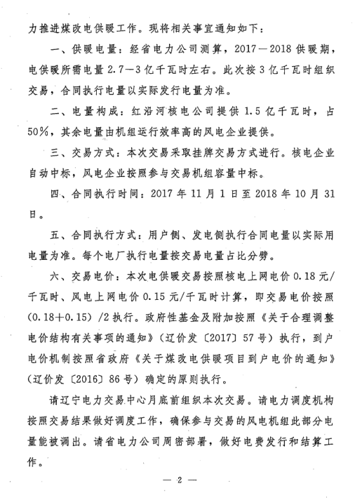 其他相關(guān)事宜按照《遼寧省工業(yè)和信息化委員會、國家能源局東北監(jiān)管局關(guān)于開展電供暖電力交易工作的通知》(遼工信電力[2017]289號)執(zhí)行。